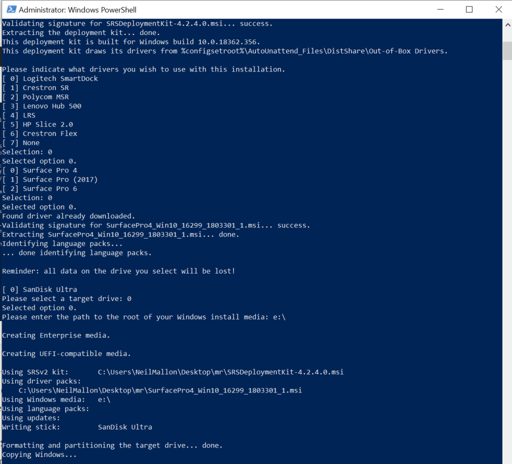 Once the USB image creation is finished, boot the Surface Pro from the USB drive (power off, press and hold volume down and power on, then release power on) to install the custom Windows 10 build to the Surface Pro. This will then automatically churn away, flash the disk from the USB build and once complete it will simply shutdown/power off.
