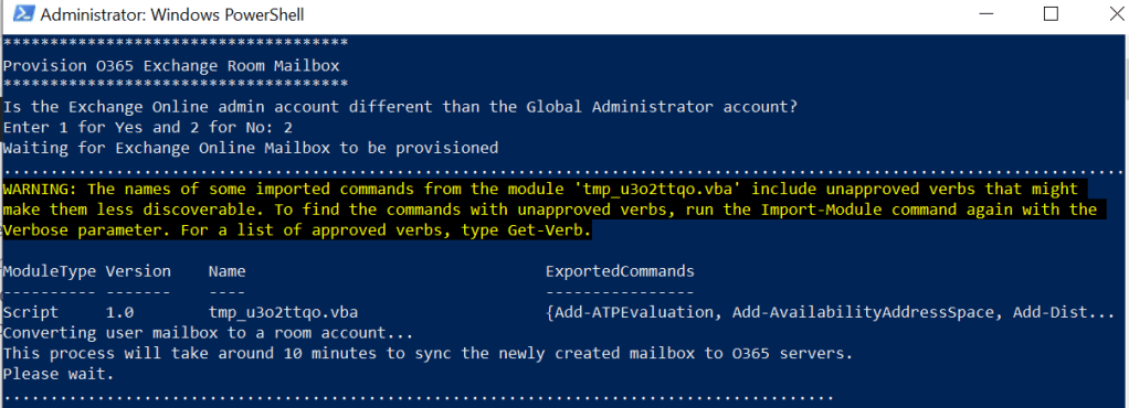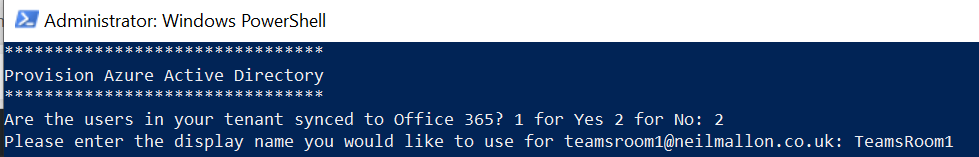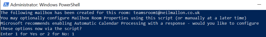 By the end of the script you will have a correctly configured Teams Meeting room account with the licenses applied ready for use. Barring any background config/replication that Microsoft need to complete the account is ‘ready’ to be used.