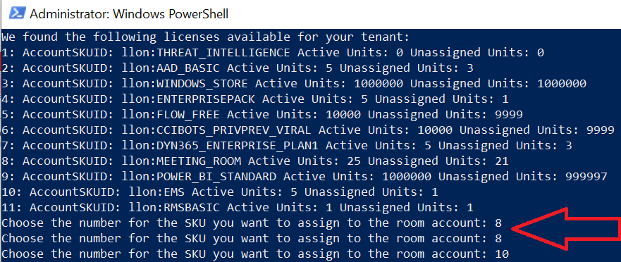 While the account and mailbox provisioning is happening you can dive over to the Office 365 portal and assign the correct license to the user and remove whatever random double-digit license you assigned. For me, its the Meeting Room license I want to assign.