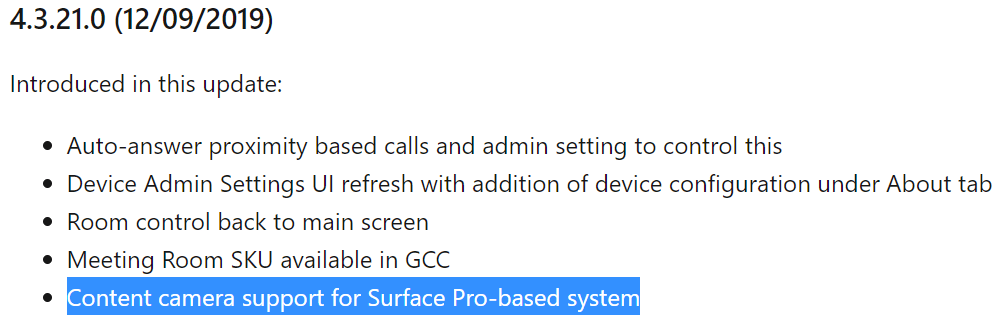 The latest version of Teams Meeting Room ‘SRSv2’ being Content Camera support to the Surface Pro device line-up – https://docs.microsoft.com/en-us/MicrosoftTeams/room-systems/srs2-release-note#43210-12092019 – in the previous week I had been trying to set up Content Camera on v4.2.4.0 without success and today (12th Dec) Content Camera has started working; coinciding with these release notes although the version stating support is later than the downloadable version. Content Camera is tested and working ok on v4.2.4.0 but no doubt will be improved with official support in v4.3.21.0.