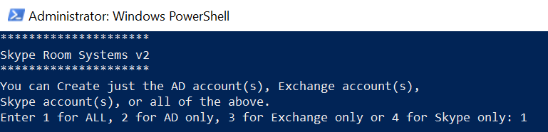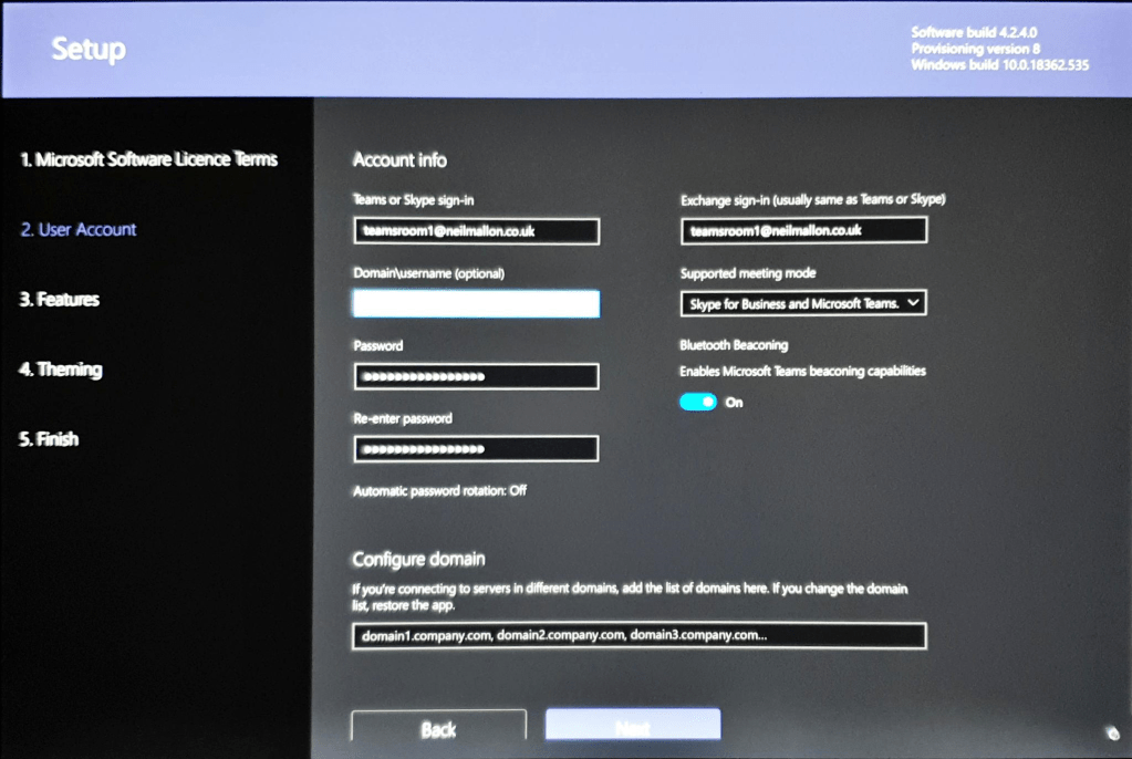 The below series of screenshots are the choices I have made to create a new account, converts to a room, configures Skype, Exchange and sets up room auto responses.