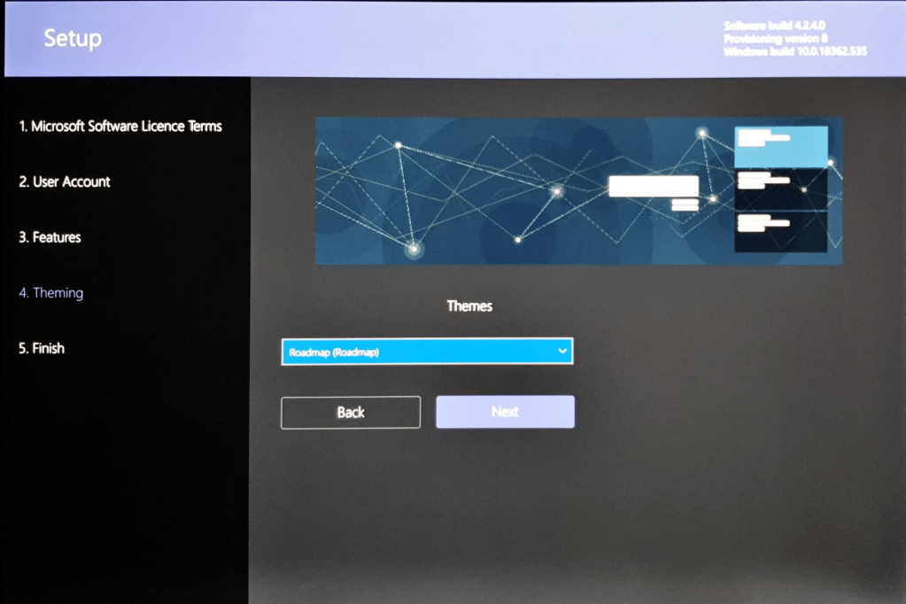 After the USB build is complete, the device is in the dock and peripherals plugged in, you can power the Surface on and you will be presented with the “Setup” screens.